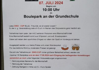 Am Samstag, den 5. Juli, fand in Münchehagen das Boule – Event des Jahres, der „Dino-Cup“ statt. Die Veranstaltung wurde auf den acht Boule-Bahnen hinter der Grundschule Münchehagen, in der Nähe der Sporthalle, ausgetragen und zog zahlreiche Teilnehmer sowie Zuschauer an. Pünktlich um 10:00 Uhr trafen sich die 16 Teams an den Spielbahnen. Nach einer herzlichen Begrüßung durch den Spartenleiter Uwe Götzinger erhielten die neu formierten Mannschaften während einer Einführungsrunde Regelkunde sowie wertvolle Tipps und Tricks von Liga-Spielern. Anschließend startete das Turnier mit vier Durchgängen und je 30 Minuten Spielzeit.